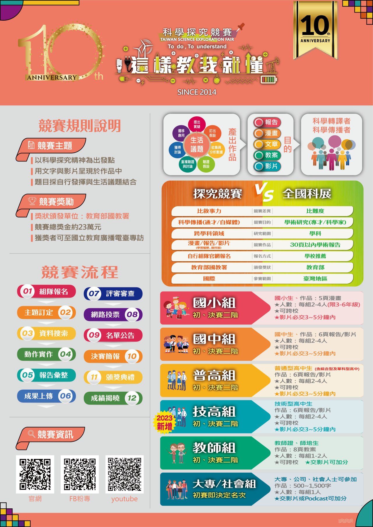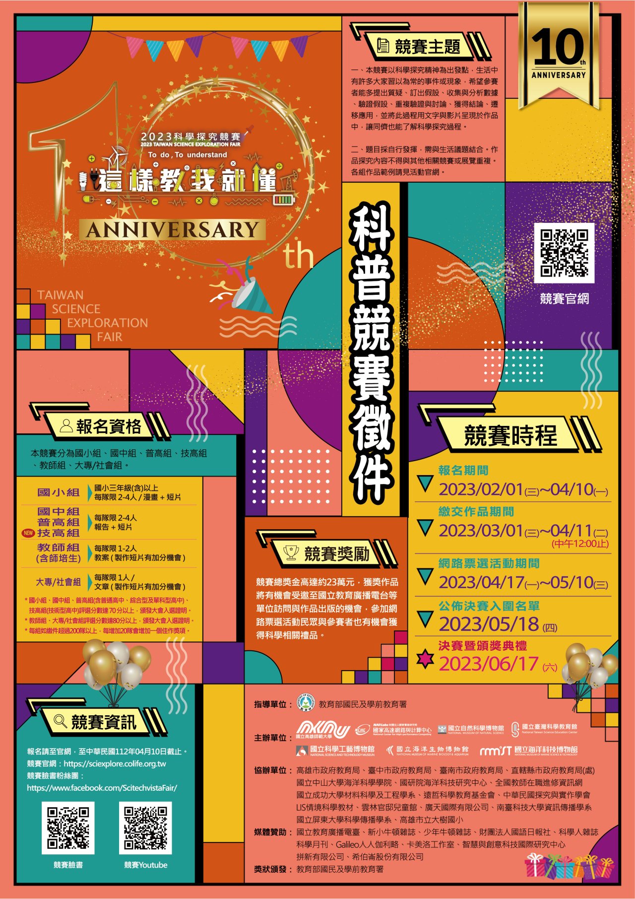 三、 | 旨揭競賽分為小學、國中、普高、技高、教師、大專社會組,每年計有上千隊來自海內、外選手參加。競賽詳情請參考官網說明(http://sciexplore.colife.org.tw/),如有疑問,請逕洽承辦人施柏亨(電話:0988-415777)。 |