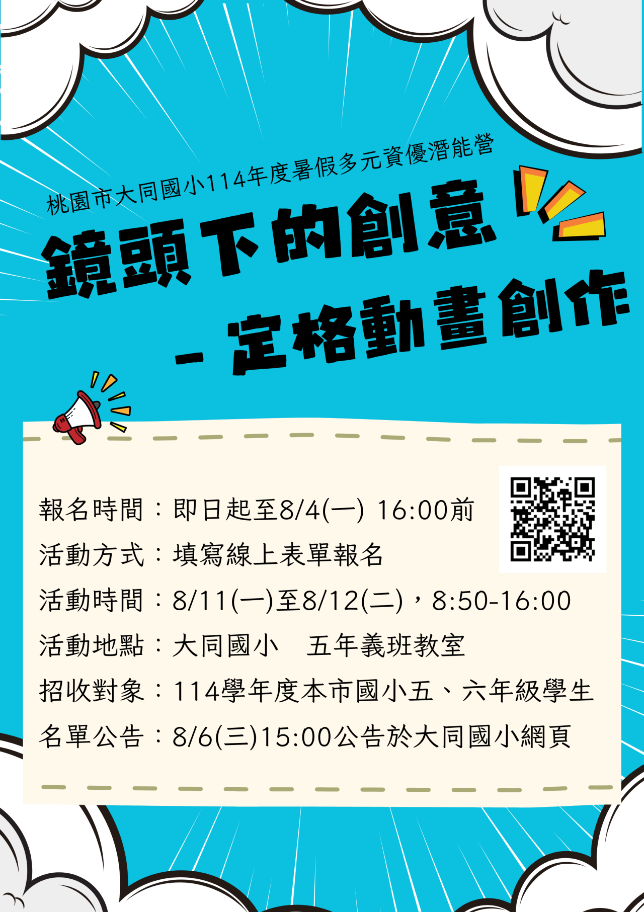 2.錄取名單將於114/8/6(三)15:00公告於大同國小網頁,敬請留意錄取後注意事項。